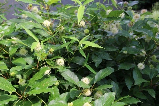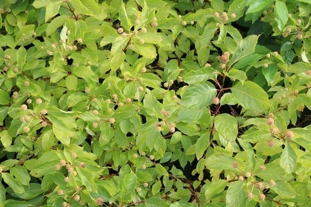 Cephalanthus occidentalis is een opgaande struik tot 150 cm hoogte.